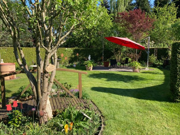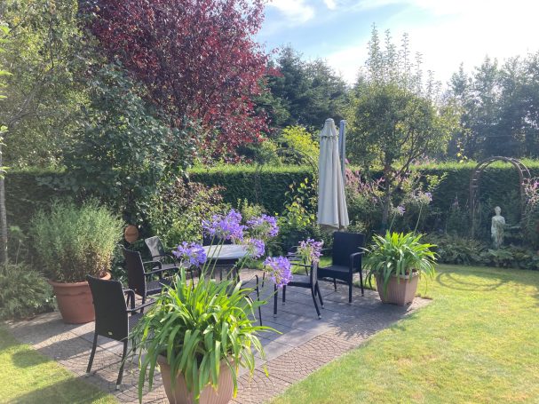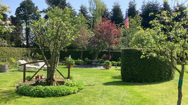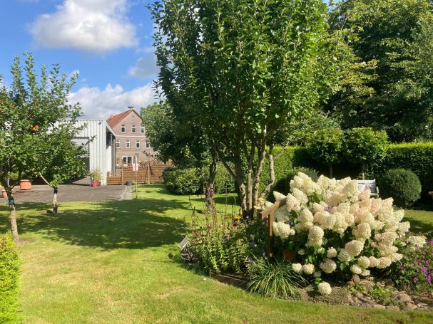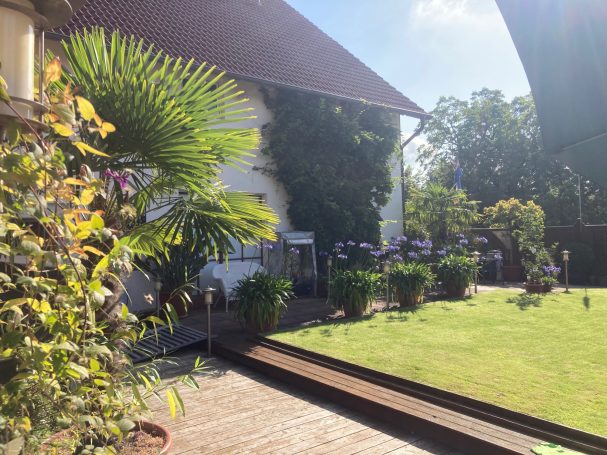 Photos of our roof garden, our big garden in the rear of the property, BBQ , our landscape, our business building with our storknest and our Mercedes Camper for our tours. (click on photos to enlarge).